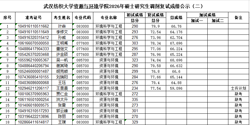根据《武汉纺织大学2026年招收攻读硕士学位研究生复试录取方案》等文件精神,现将十大色碟网站 2026年硕士研究生第一轮调剂复试成绩公示。公示时间:2026年4月11日-13日。