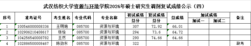 根据《武汉纺织大学2026年招收攻读硕士学位研究生复试录取方案》等文件精神,现将十大色碟网站 2026年硕士研究生第四轮调剂复试成绩公示。公示时间:2026年4月15日-17日