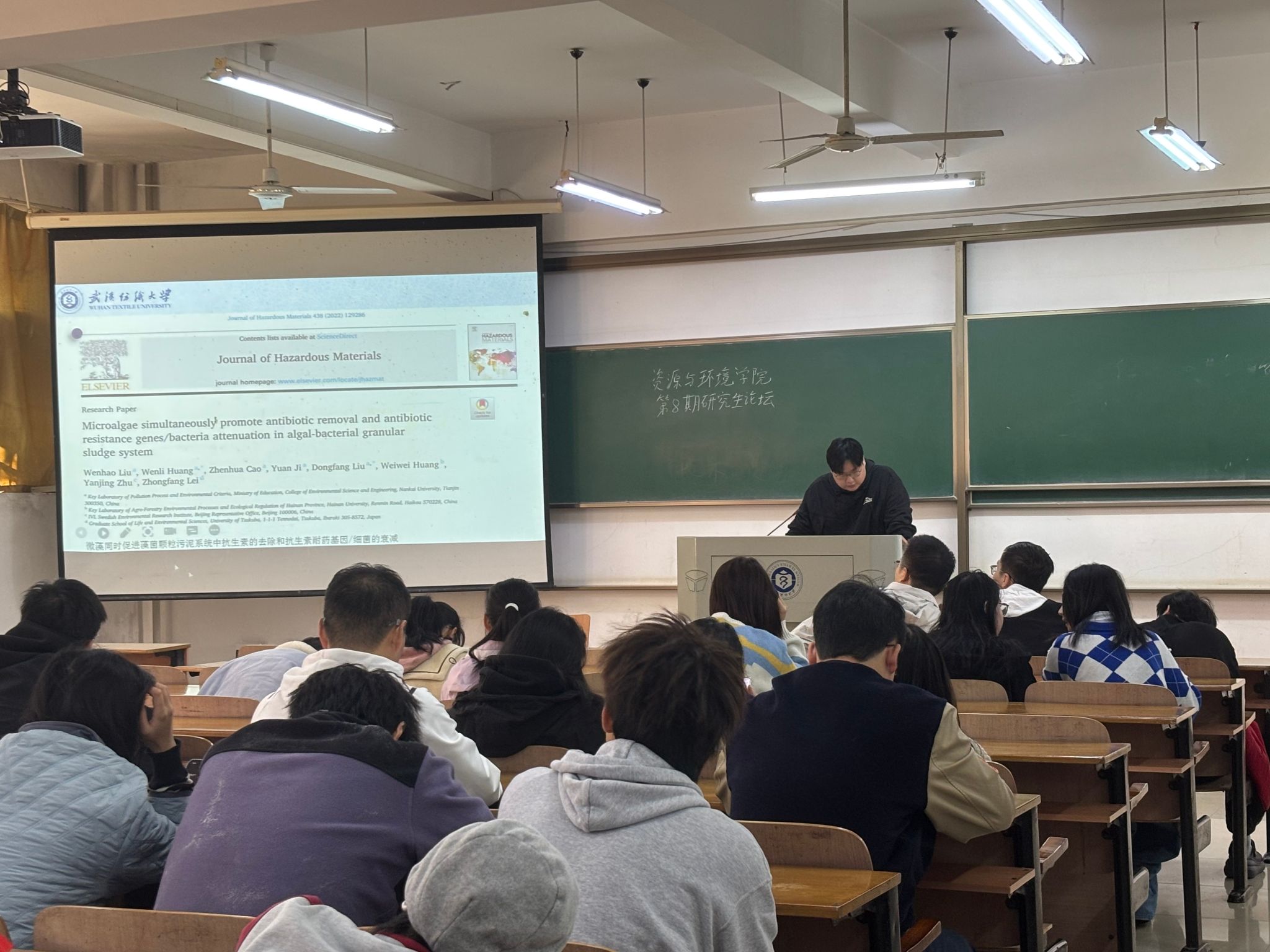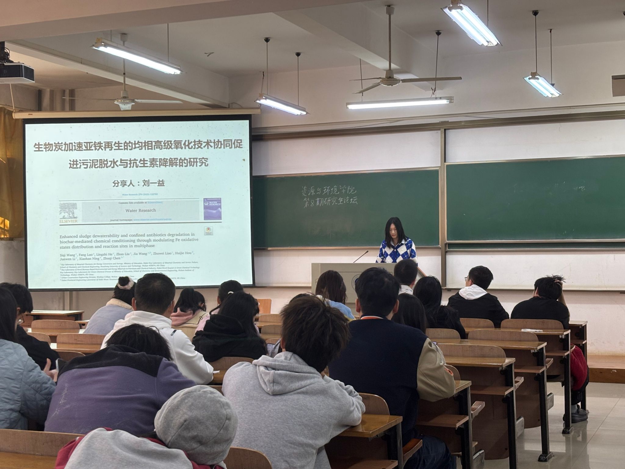 谈佳越同学探讨了“微藻同时促进藻菌颗粒污泥系统中抗生素的去除和抗生素耐药基因/细菌的衰减”展开,对比了藻菌颗粒污泥(ABGS)与细菌颗粒污泥(BGS)处理含2-4mg/L四环素(TC)、磺胺嘧啶(SDZ)废水。ABGS以栅藻、小球藻为优势微藻,TC/SDZ去除率79.0%、94.0%,较BGS高4.3-5.0%,且ARGs、MGEs及耐药宿主丰度更低,营养去除优、稳定性好,证实ABGS是更优含抗生素废水处理技术。
