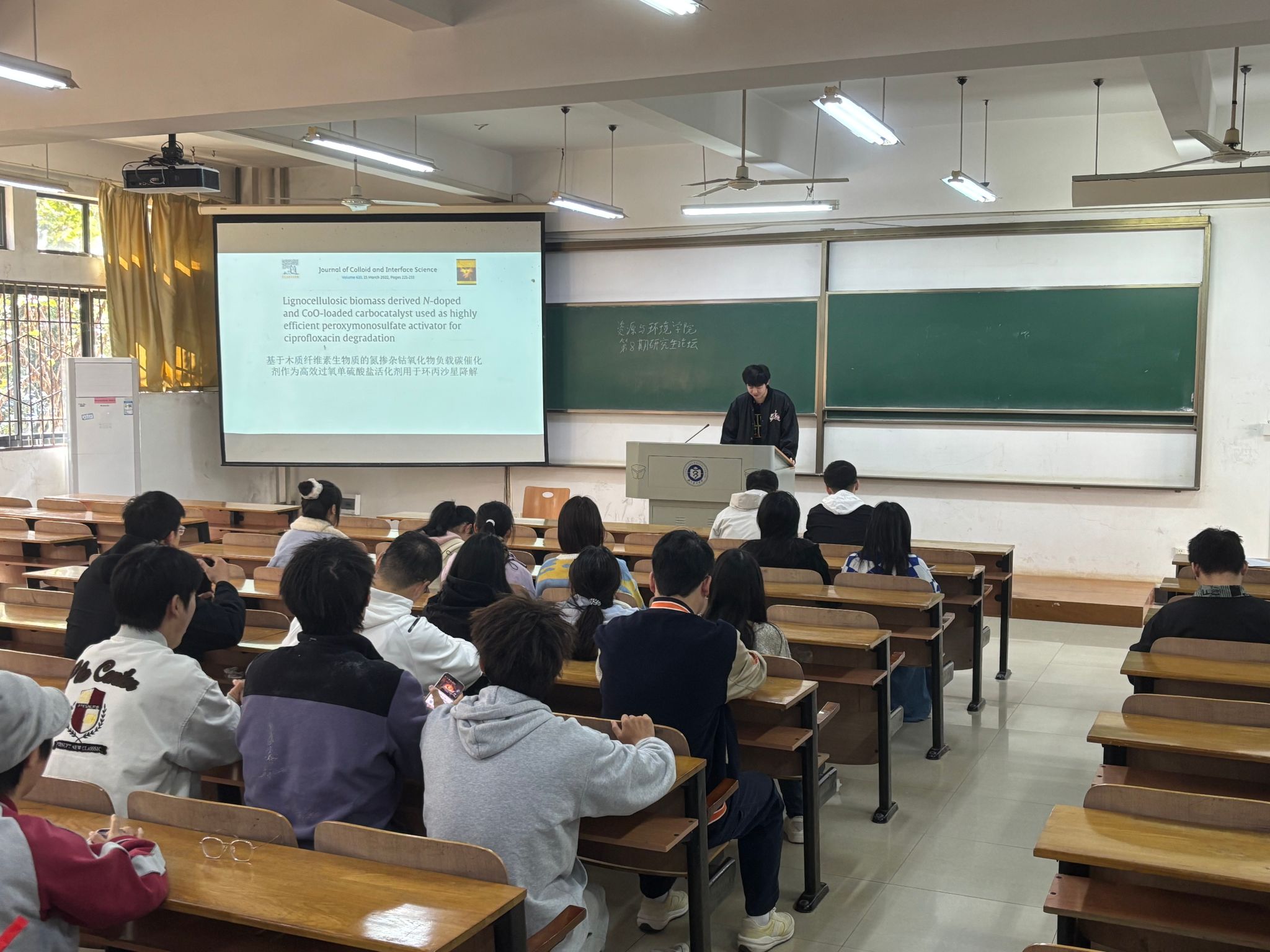 陈吉骜同学探讨了“基于木质纤维素生物质的氮掺杂钴氧化物负载碳催化剂作为高效过氧单硫酸盐活化剂用于环丙沙星降解”这篇论文。讲解了本实验通过浸渍碳化的简单合成工艺合成了n掺杂和co包埋的碳催化剂,利用电子在CoO-N /BC有序碳网络上的定向流动,目标污染物可以通过自由基和非自由基途径逐步分解。