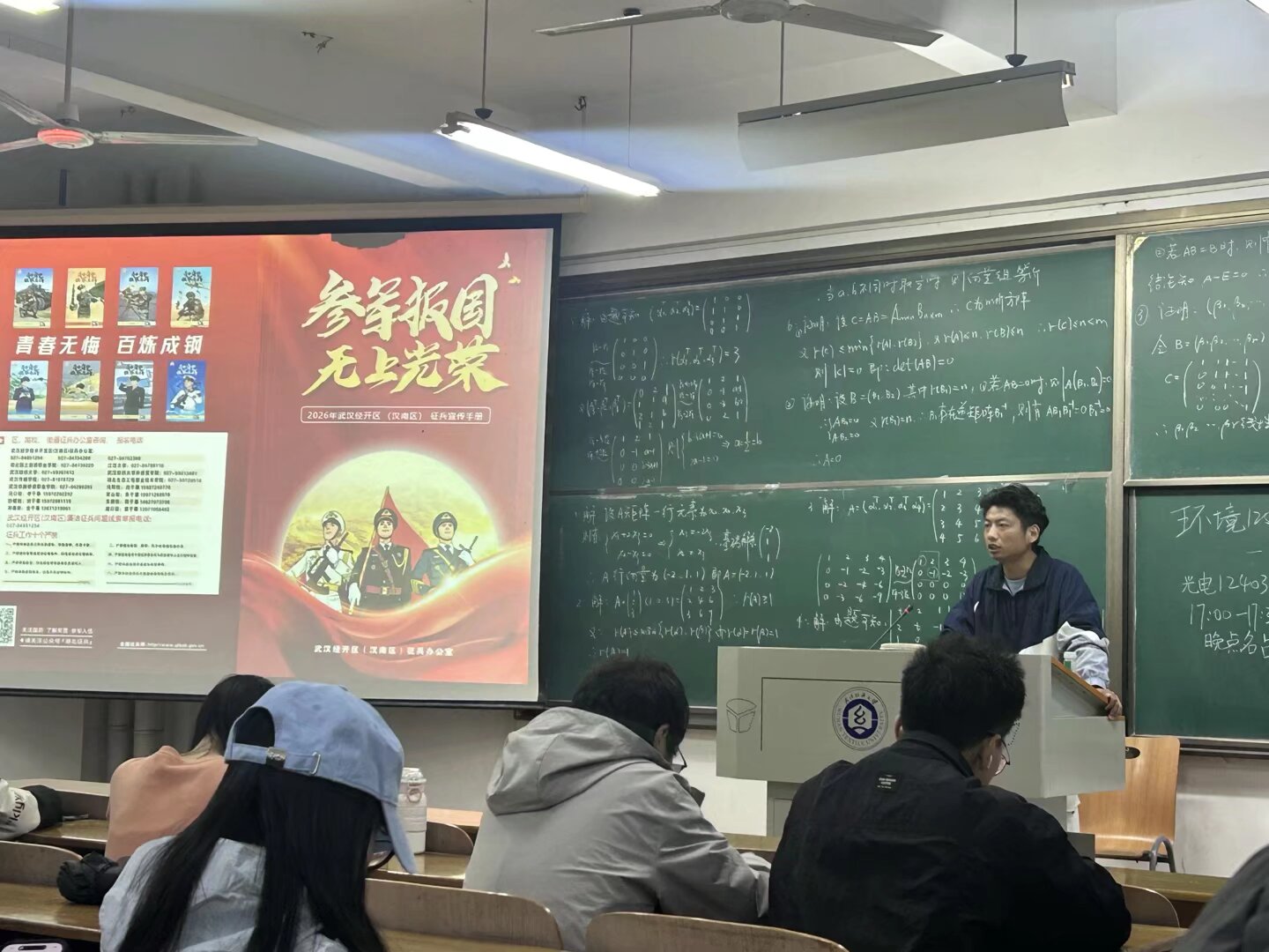开展主题教育班会、入伍政策宣讲课、退役学生士兵朋辈交流系列活动,扎实推进开展征兵“三个一”宣传工作。