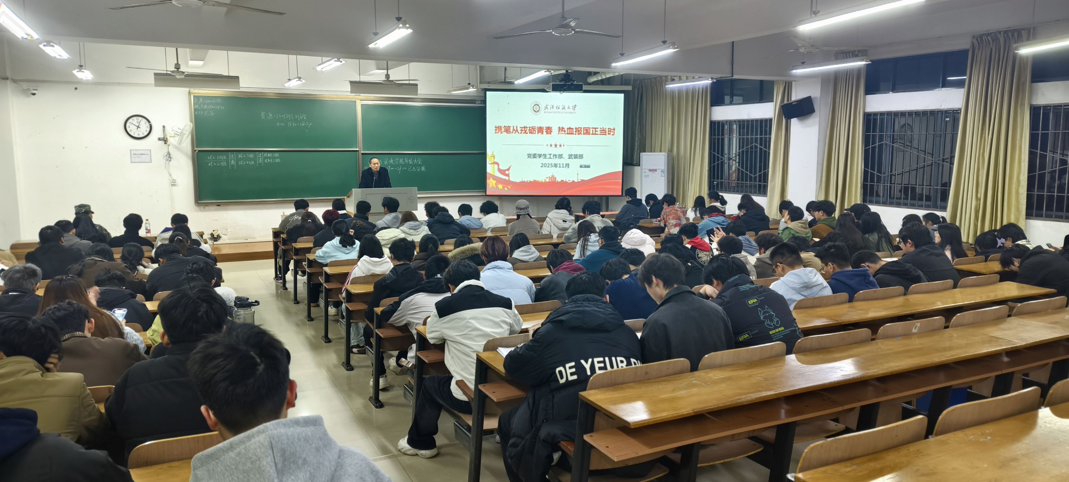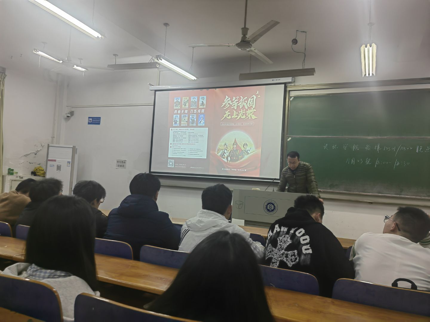 在政策解读环节,老师们详细解读了征兵宣传手册,系统讲解了2026年征兵工作的具体安排。内容涵盖入伍条件、报名流程、体格检查标准、政治考核要求等关键信息。针对大学生群体特别关注的学业保障政策,详细介绍了“专科生免试专升本”、“考研专项计划”等优惠政策,以及国家和湖北省出台的系列惠兵措施,包括义务兵津贴、军士工资待遇、退役安置保障等,让同学们深刻感受到“让军人成为全社会尊崇的职业”正在转化为实实在在的政策红利。