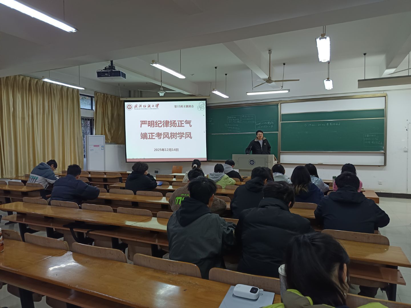 班会伊始,老师们强调诚信是中华民族传统美德,更是学术研究与学业发展的立身之本。结合四六级考试、研究生考试及期末考试临近的实际,通过解读《中华人民共和国刑法》《国家教育考试违规处理办法》等法律法规,以及武汉纺织大学相关违纪处理规定,明确考试违纪作弊的认定标准与严重后果。两起考试作弊典型案例的剖析,让学生直观感受到法律的威严与作弊的惨痛代价,进一步绷紧“诚信应考”之弦。