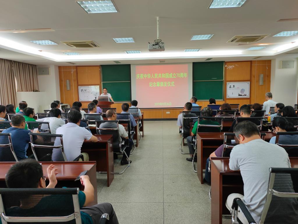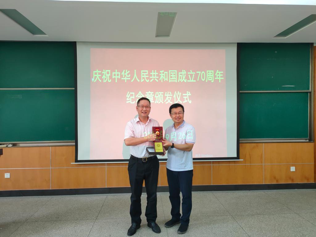 夏东升教授获此殊荣。9月26日下午,校长彭育园教授亲自到崇礼楼三楼会议室为其颁发纪念章。