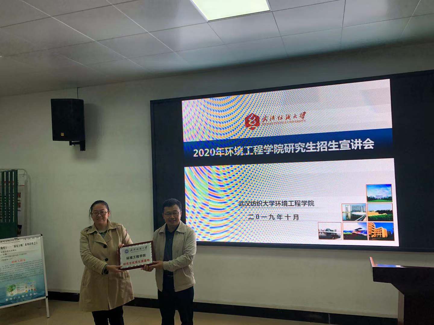 2019年10月16日,我院夏东升院长、潘飞副院长等一行赴武汉生物工程色碟 进行了我院2020年研究生招生宣传工作,潘飞副院长进行了招研究生招生宣讲,夏东升院长进行了我院优质生源基地授牌,并开展了毕业生回访,看望了在此工作的2012级毕业生陈欣。